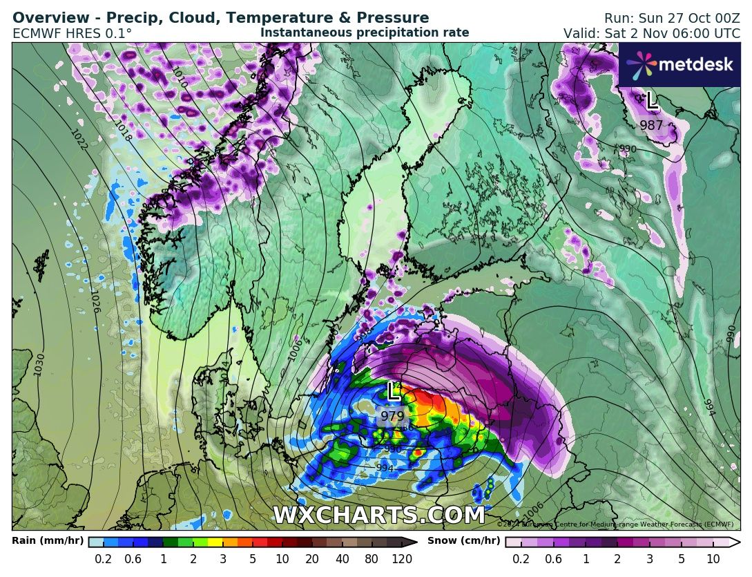 Naktī uz piektdienu paredzams pirmais aktīvais ciklons (GFS tā centru šobrīd prognozē Botnijas līča ziemeļos, bet ECMWF - virs Somijas līča, attiecīgi krietni tuvāk mums). Ciklons virzīsies uz A, DA un pie mums ienesīs aukstu gaisa masu, bet sniegs varētu palikt tālāk uz austrumiem, Latvijā iespējams stiprs lietus. Sestdienas rītā ECMWF prognozē otru ciklonu ar centru virs Baltijas, stipru ZR puses vēju, puteni un pēc tam līča un jūras efekta sniega nokrišņus, bet GFS - vēl iepriekšējā ciklona ietekmē no līča nestus sniega nokrišņus galvenokārt sestdien. Šeit uzreiz jāpiemin, ka prognozes ir ļoti dažādas un diez vai ātrāk par ceturtdienu būs redzama kaut cik patiesa situācija, jo iespējama kā vētra, tā sniegputenis, tā stiprs lietus, tā tikai parasti rudenīga, bet pavēsa diena. Kā tur būs - to rādīs laiks!