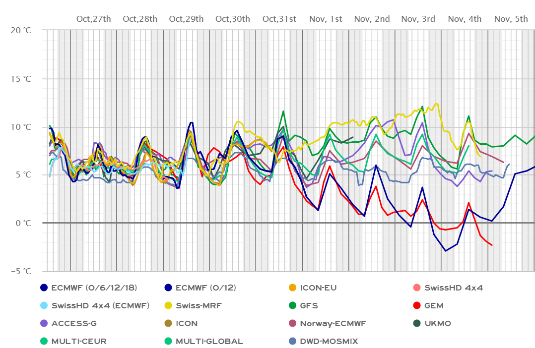 Lai gan kopumā no Eiropas DR mūsu virzienā ieplūdīs silta gaisa masa, ECMWF jaunākajā izlaidumā prognozē risku, ka tā Baltijas valstis nemaz nesasniegs, jo anticiklons no Arktikas Eiropas ZA ienesīs aukstu gaisu, kas vismaz daļēji atnāktu arī līdz mums. Turpretī GFS prognozē, ka saglabāsies gaisa kustība no D, DR un nākamais ciklons atnesīs arī siltāku gaisu. Prognozes brīvdienām dienas laikā ir stap +2 ... +12 C, savukārt naktīs -4 ... +6 C robežās. Stabils un ilgāks vēsāka gaisa periods tālākās prognozēs joprojām nav redzams.