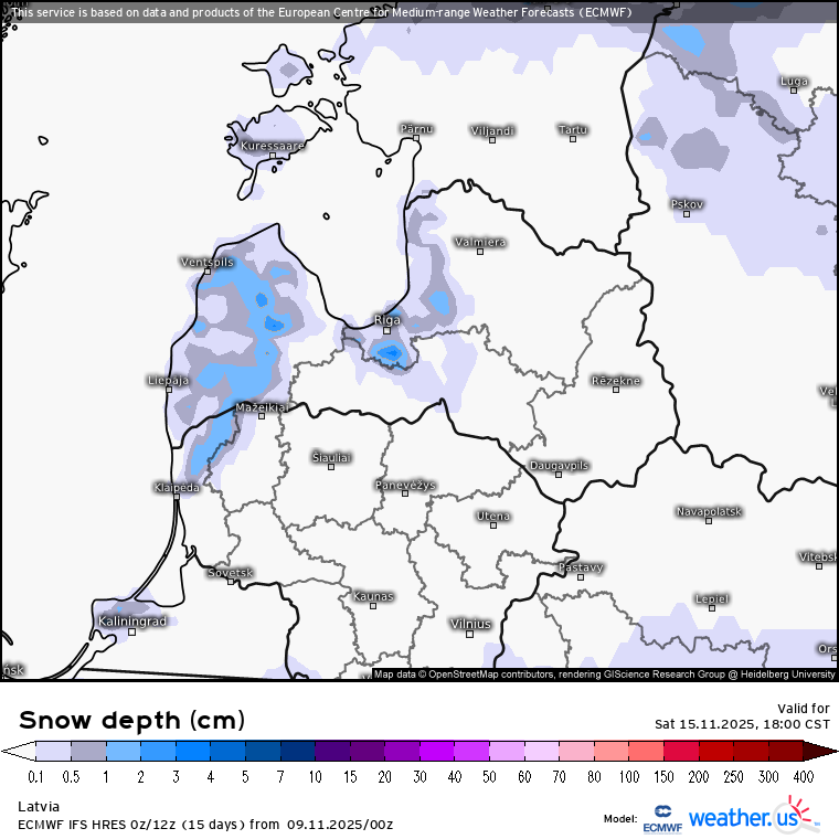 Prognozētā sniega sega Latvijā naktī uz svētdienu, 16. novembri (weather.us)
