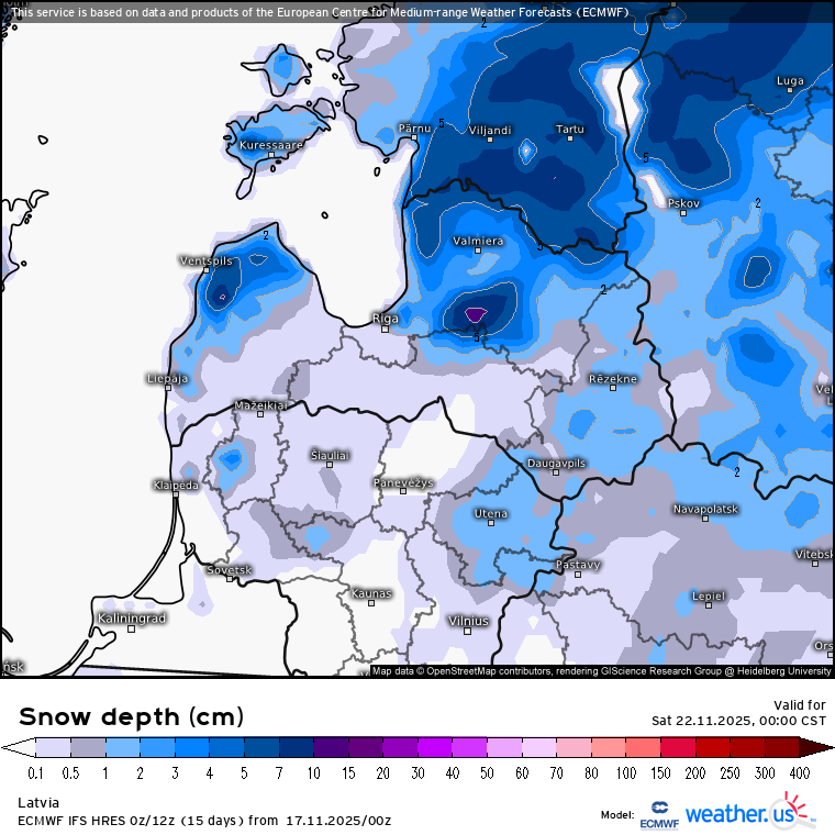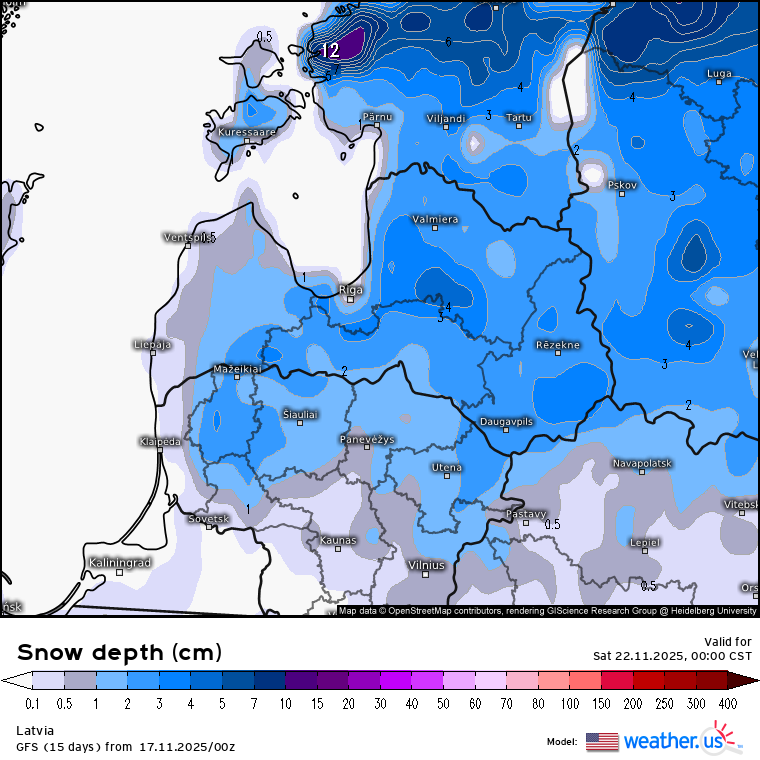GFS un ECMWF prognozētais sniega segas biezums naktī uz svētdienu (weather.us)