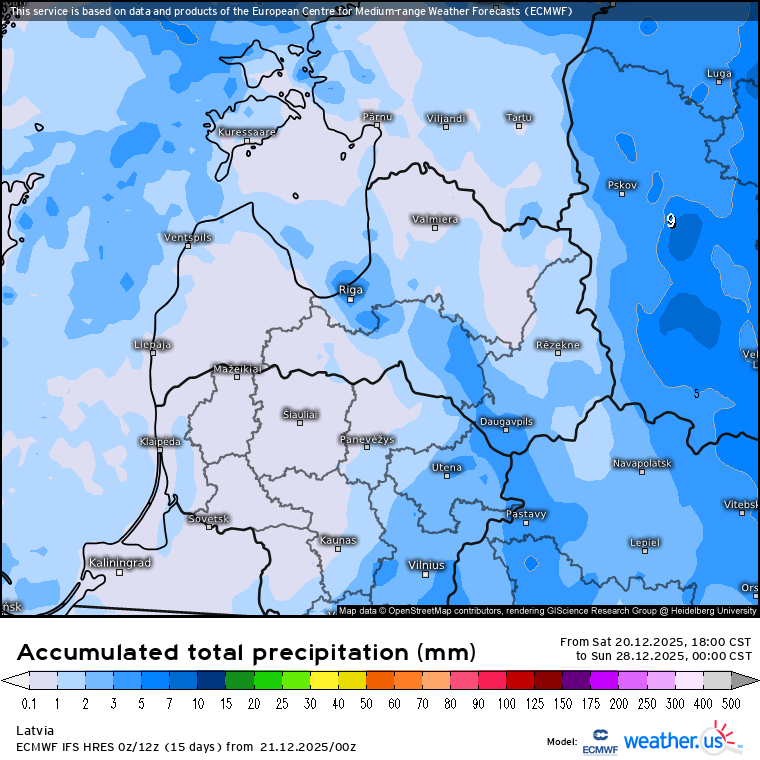 Kopējais prognozētais nokrišņu daudzums līdz 28.12. (weather.us)