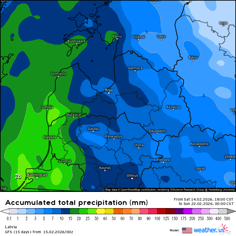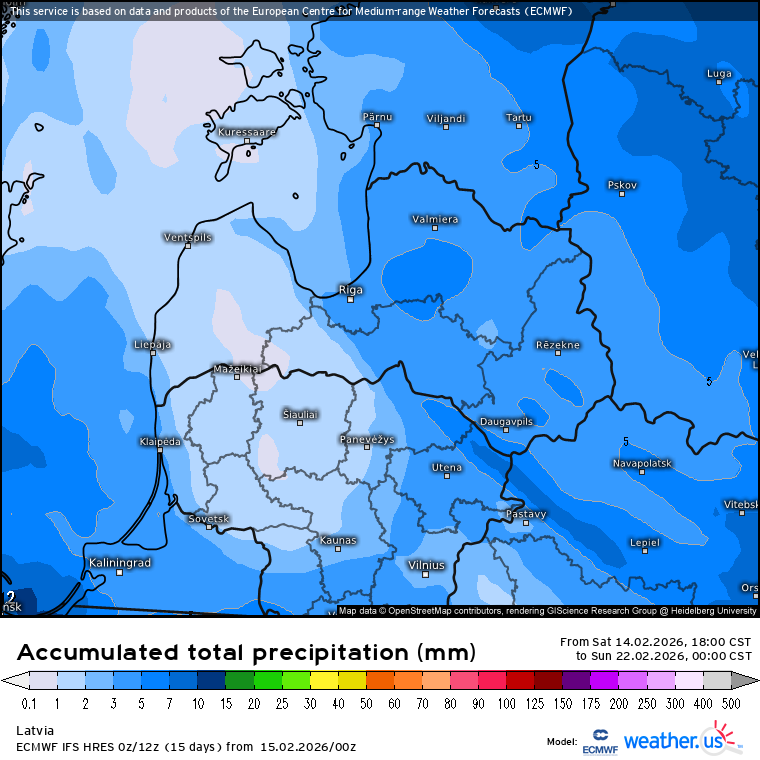 Kopējā nokrišņu daudzuma prognozes līdz svētdienai (weather.us)